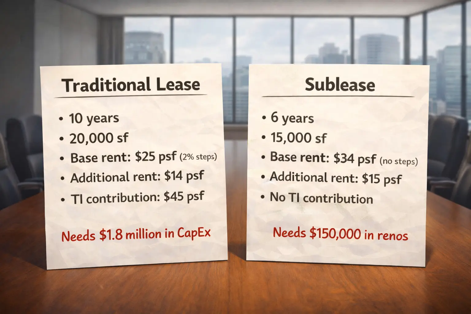 "The sublease puts us in the same building as our largest client" gets mixed with "but the cost per square foot is higher" and "the commitment is shorter" and "we'd avoid having to invest in tenant improvements."